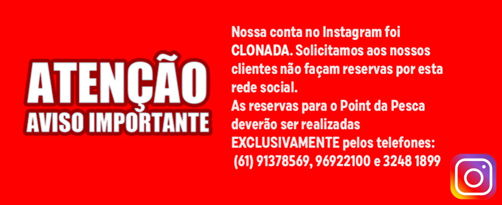 ATENÇÃO! Nossa conta no Instagram foi CLONADA. Solicitamos aos nossos clientes que não façam reservas por esta rede social. As reservas para o Point da Pesca deverão ser realizadas EXCLUSIVAMENTE pelos telefones (61) 91378569, 96922100 e 3248 1899